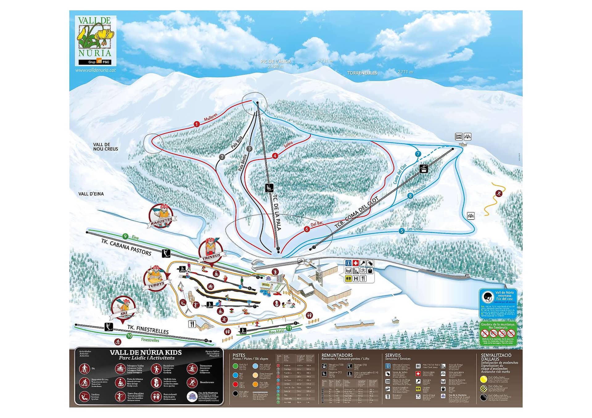 Vall de Núria Localizada en el Ripollès, es una estación de esquí familiar y perfecta para principiantes. Las pistas no son demasiado largas ni con fuertes pendientes. Es uno de los destinos más económicos, tanto por el precio de los forfaits, cómo por el coste del albergue donde se hospedan la mayoría de esquiadores. La Vall de Núria, ofrece un entorno natural impresionante y actividades complementarias como trineos y raquetas de nieve.